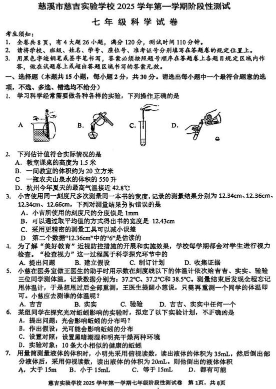 浙江省宁波市慈溪市慈吉实验学校2025学年第一学期阶段性测试 七年级科学试卷(扫描PDF版,无答案 1.1-2.2)