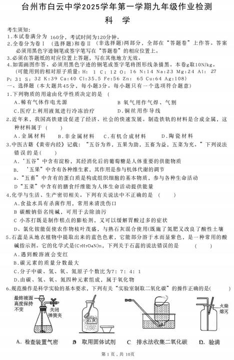 浙江省台州市白云中学2025学年第一学期九年级作业检测 科学试卷(扫描PDF版,无答案 1、2、4章)