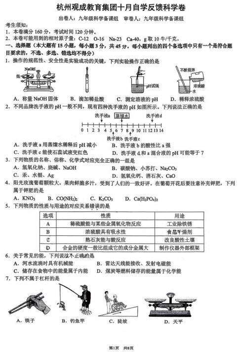 浙江省杭州市观成教育集团2025学年第一学期九年级十月自学反馈 科学卷(扫描PDF版,无答案 1.1-3.4)