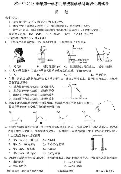 浙江省杭州市第十中学2025学年第一学期九年级科学学科阶段性测试卷 问卷(扫描PDF版,无答案 1.1-3.4)