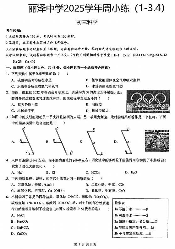 浙江省金华市婺城区丽泽中学2025学年周小练(1-3.4) 初三科学(扫描PDF版,无答案)