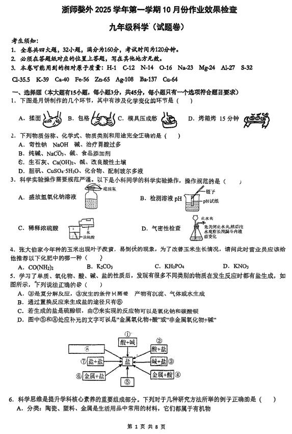浙江省金华市婺城区浙江师范大学婺州外国语学校2025学年第一学期10月份作业效果检查 九年级科学(试题卷)(扫描PDF版,无答案 1-2章)