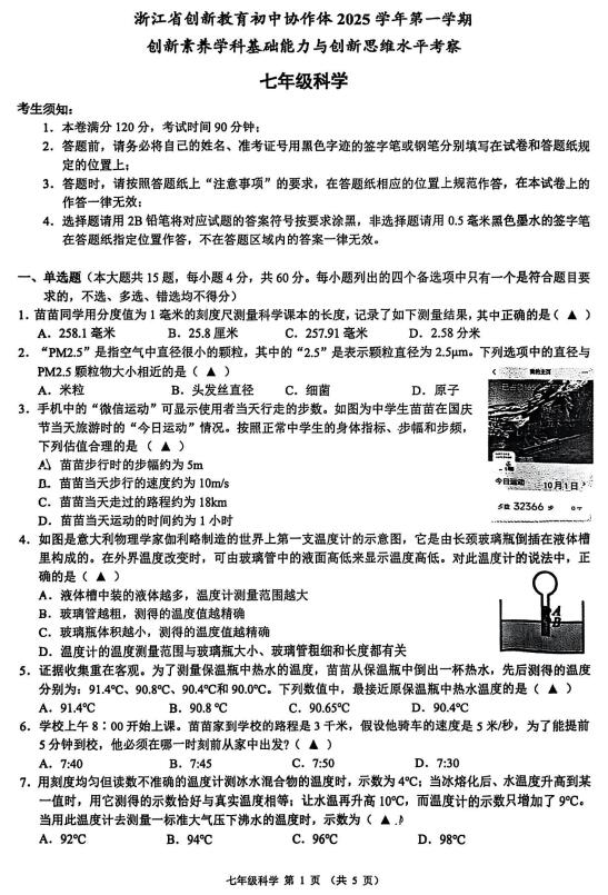 2025年10月浙江省创新教育初中协作体创新素养综合考察七年级科学一试试卷(扫描无答案)