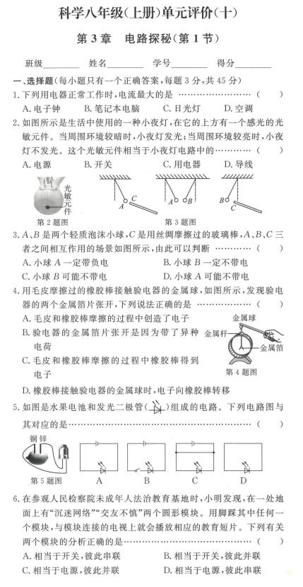 八上科学周周清 第三章 电路探秘第(第1节)(扫描附答案)