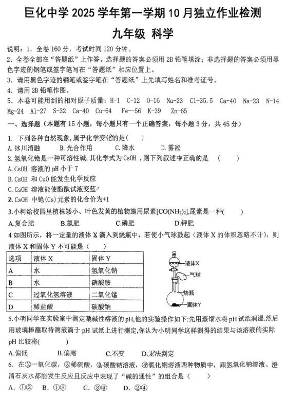 浙江省衢州市柯城区巨化中学2025学年第一学期10月独立作业检测 九年级科学(扫描PDF版,无答案 第1章)