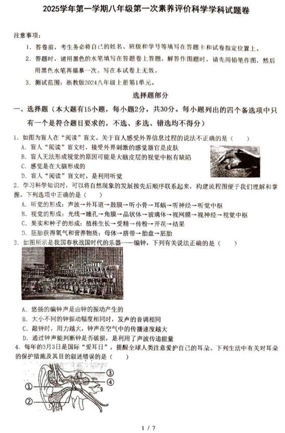 浙江省嘉兴市桐乡市启新学校2025-2026学年八年级上学期10月月考科学试题(胶版无答案)