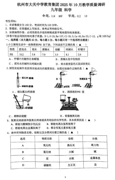 浙江省杭州市大关中学2025-2026学年九年级上学期科学10月月考试题(到第3章,扫描pdf版,无答案)