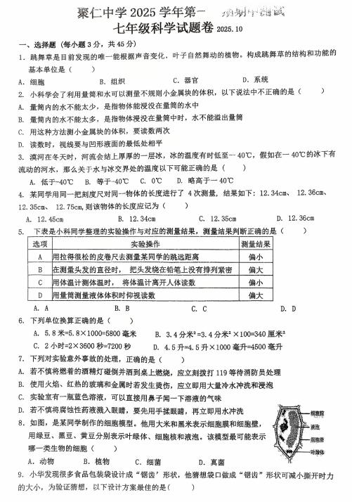 浙江省金华市兰溪市聚仁中学2025学年第一学期七年级科学试题卷(扫描PDF版,无答案 1.1-2.1)