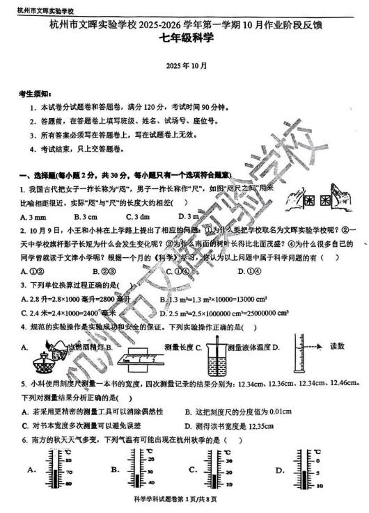 浙江省杭州市文晖实验学校2025-2026学年七年级上学期十月月考科学试题(扫描,无答案)