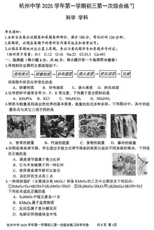 浙江省杭州中学2025-2026学年九年级上学期10月月考科学试卷(扫描,无答案)