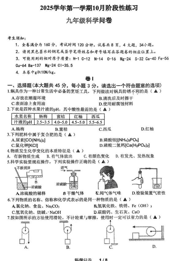 浙江省杭州养正学校(公办)2025-2026学年九年级上学期10月月考科学试题(扫描,无答案)