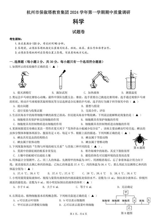 杭州市保俶塔教育集团2024学年第一学期期中质量调研(扫描)(附答案)