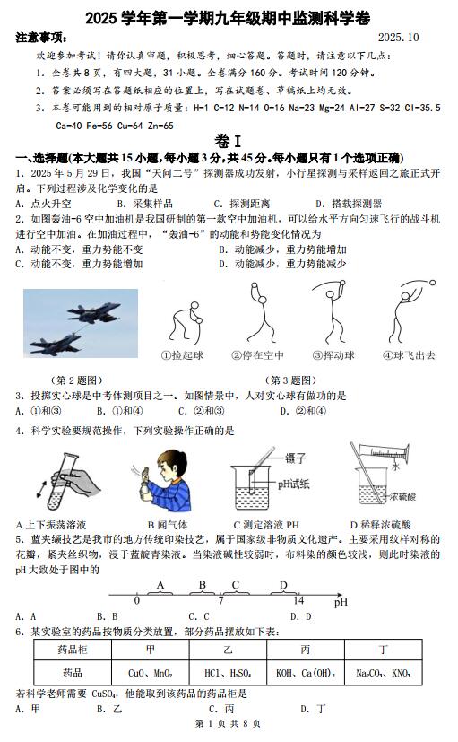 1. 2025 年 5 月 29 日, 我国“天问二号” 探测器成功发射, 小行星探测与采样返回之旅正式开 启。 下列过程涉及化学变化的是 A. 点火升空 B. 采集样品 C. 探测距离 D. 搭载探测器 2. 如图轰油-6 空中加油机是我国研制的第一款空中加油机, 可以给水平方向匀速飞行的战斗机 进行空中加油。 在加油过程中, “轰油-6” 的动能和势能变化情况为 A. 动能不变, 重力势能不变 B. 动能减少, 重力势能增加 C. 动能不变, 重力势能增加 D. 动能减少, 重力势能减少