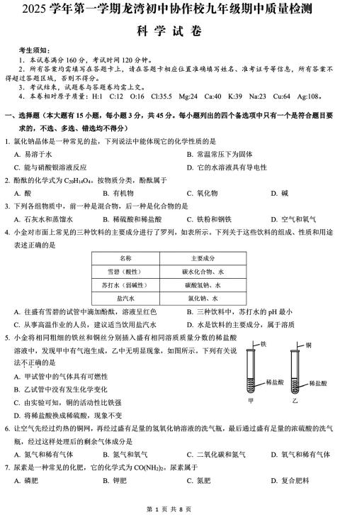浙江省温州市龙湾区2025-2026学年第一学期九年级期中科学质量检测卷(扫描含答案)