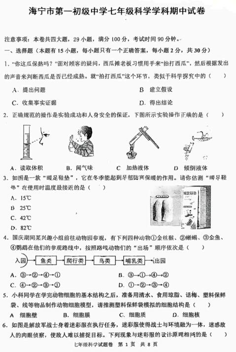 浙江省嘉兴市海宁市第一初级中学七年级科学学科期中试卷(扫描PDF版,无答案 1-2章)
