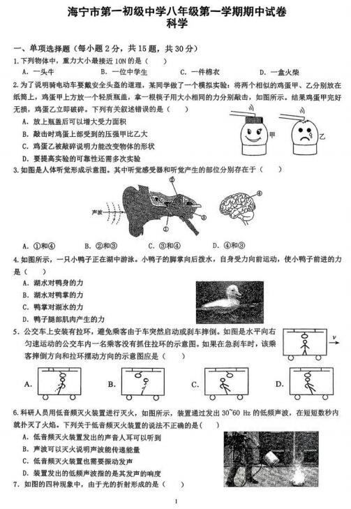 浙江省嘉兴市海宁市第一初级中学2025学年八年级第一学期期中试卷 科学(扫描PDF版,无答案 1-2章)