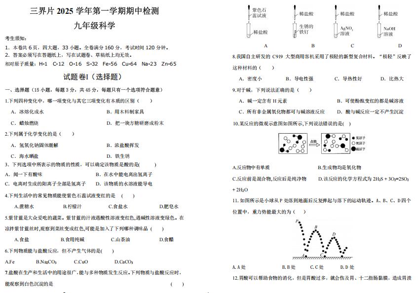 7.盐酸在生产和生活中的用途很广,能与多种物质发生反应。下列物质与盐酸反应时,