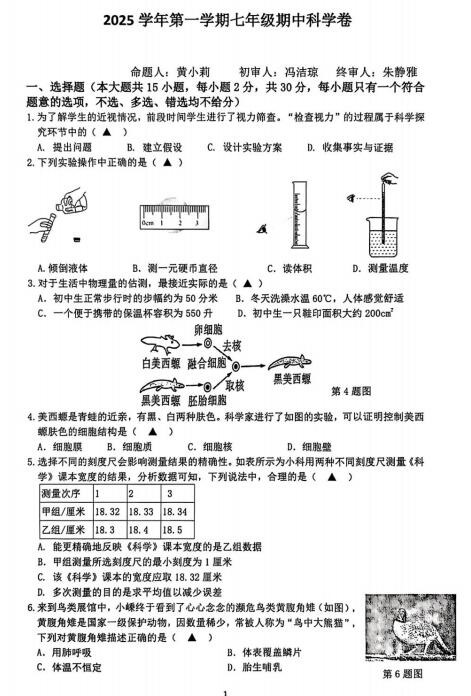 浙江省宁波市江北区洪塘片区2025-2026学年七年级上学期期中考试科学试卷(扫描PDF版 1-2章 含答案)