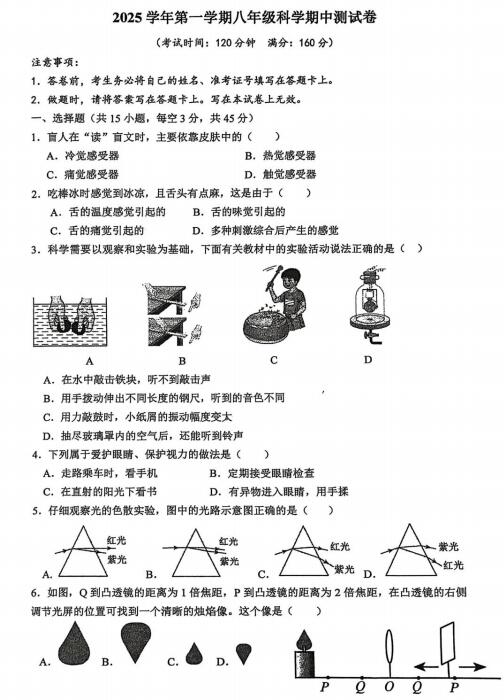 浙江省舟山市五校联考2025学年第一学期八年级科学期中测试卷(到第2章,扫描pdf版,无答案)