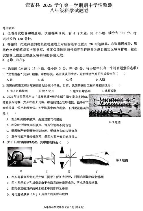 浙江省湖州市安吉县2025学年第一学期期中学情监测八年级科学试卷(到第2章,扫描pdf版,含答案)