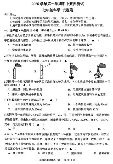 浙江省长兴县龙山中学共同体2025学年第一学期期中素养测试 七年级科学试题卷(扫描PDF版,含答案 1-2章)