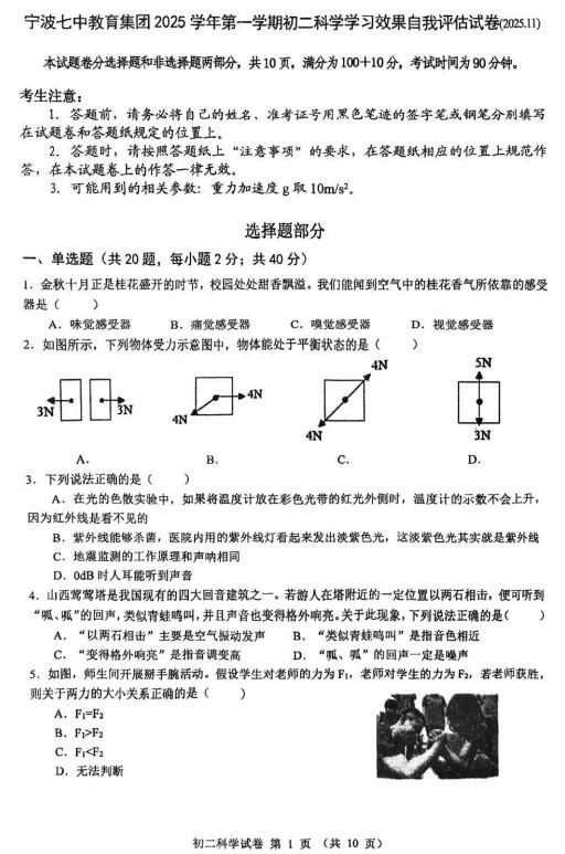 浙江省宁波市第七中学2025-2026学年八年级上学期期中考试科学试卷(到第2章,扫描pdf版,无答案)
