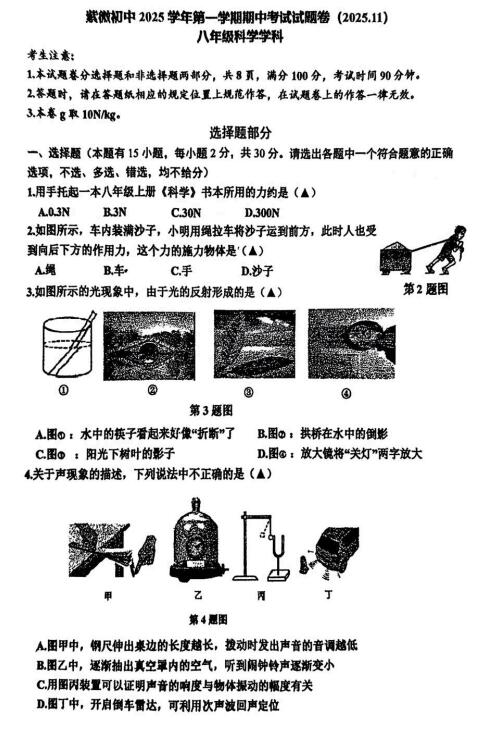 浙江浙嘉联盟紫薇初中2025-2026学年八年级上学期科学学科期中试卷(到第2章,扫描pdf版,无答案)
