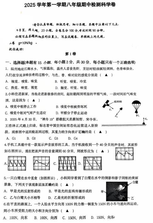 浙江省温州市瑞安市六校联考2025学年第一学期八年级期中检测科学卷(PDF版,扫描无答案 1-2章)