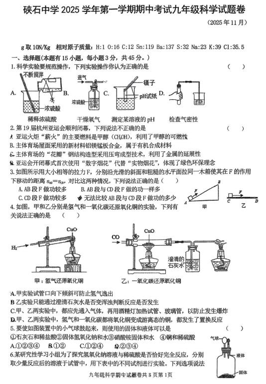 浙江省海宁市硖石中学2025-2026学年九年级上学期11月期中考试科学试题(到第3章,扫描pdf版,无答案)