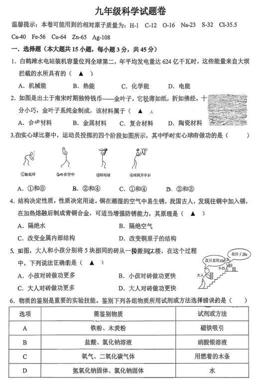 浙江省湖州市第四中学2025学年第一学期九年级科学试题卷(扫描PDF版,无答案 1.1-3.3)