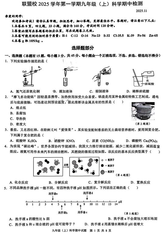 浙江省温州市瑞安市五校联考(集云实验学校等)联盟校2025学年第一学期九年级(上)科学期中检测(扫描PDF版,无答案 1.1-3.4)