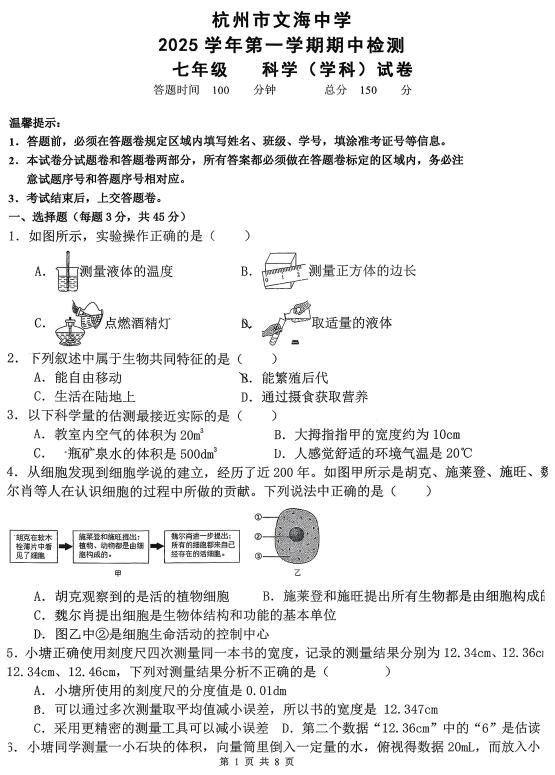 浙江省杭州市文海中学2025-2026学年七年级上学期期中检测科学试卷(扫描版,无答案)