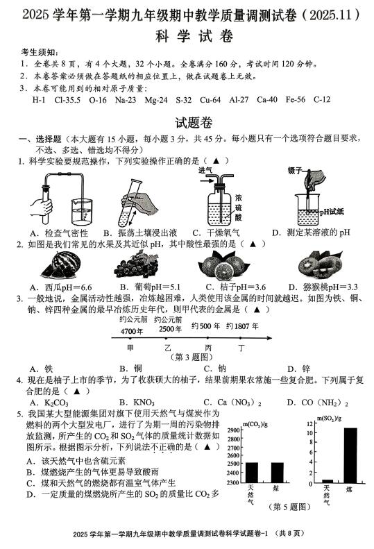 浙江省绍兴市柯桥区2025学年第一学期九年级期中教学质量调测试卷 科学试卷(扫描PDF版,无答案 1.1-3.2)