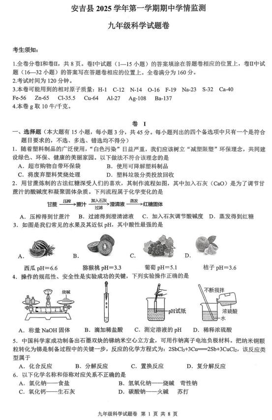 浙江省湖州市安吉县2025学年第一学期期中学情监测 九年级科学试题卷(扫描PDF版,无答案 1-2章)