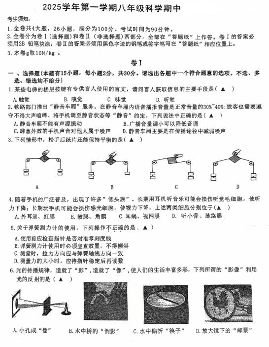 浙江省温州市南浦实验中学2025学年第一学期八年级科学期中测试 科学试题(扫描PDF版,无答案 1-2章)