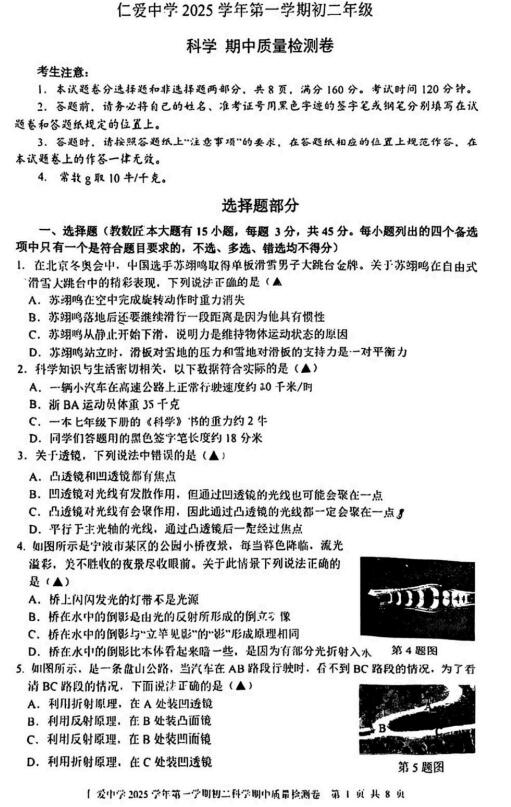 浙江省宁波市镇海区仁爱中学2025-2026学年八年级上学期期中科学试卷(扫描pdf版,无答案1-2章)