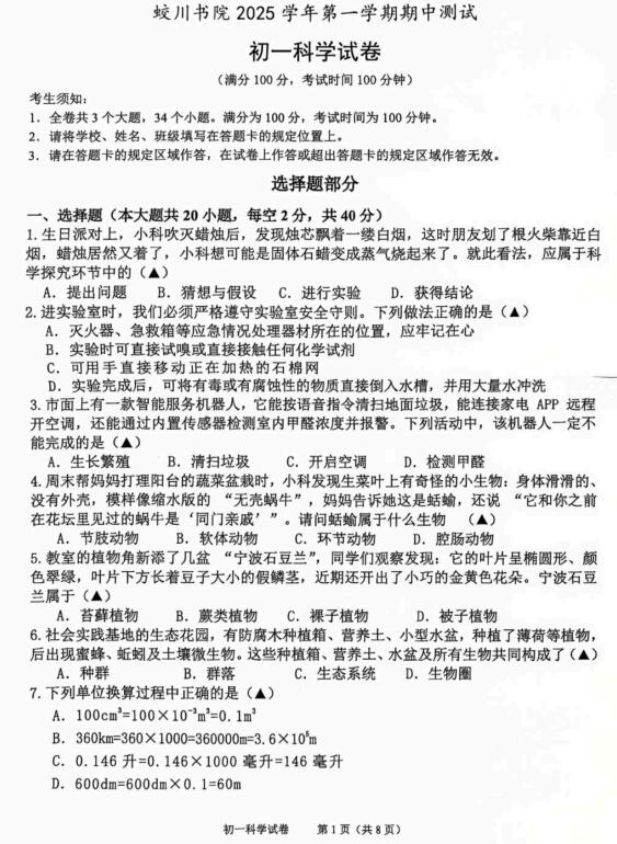 浙江省宁波市镇海区蛟川书院2025学年第一学期期中测试 初一科学试卷(扫描PDF版,无答案 1-2章)