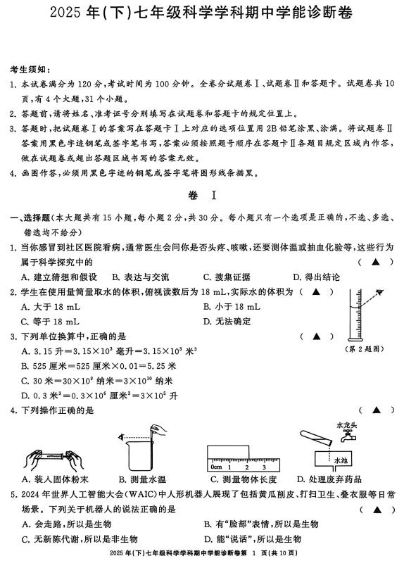 2025-2026学年浙共体七上科学期中试卷(扫描含参考答案)