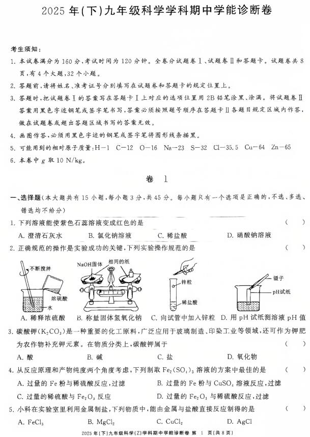 2025-2026学年浙共体九上科学期中(扫描含答案)