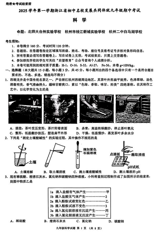 浙江省初中名校发展共同体2025-2026学年11月九年级上册科学期中测试卷(1.1-3.5,扫描含答案)