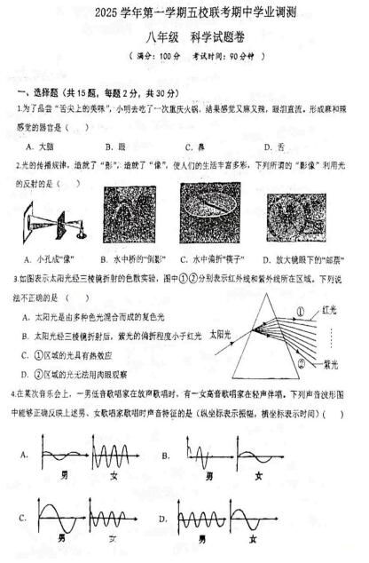 浙江省绍兴市嵊州市2025学年第一学期五校联考期中学业调测 八年级科学试题卷(扫描PDF版,含答案 1-2章)