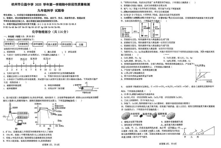浙江省杭州市公益中学2025学年第一学期期中阶段性质量检测 九年级科学试题卷(扫描PDF版,无答案 1.1-3.2+第4章)