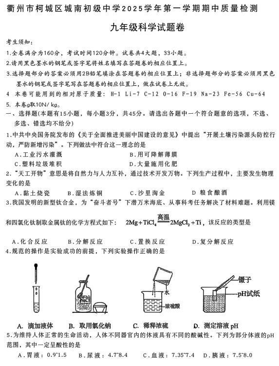 浙江省衢州市柯城区城南初级中学2025学年第一学期期中质量检测 九年级科学试题卷(扫描PDF版,无答案 1.1-3.3)