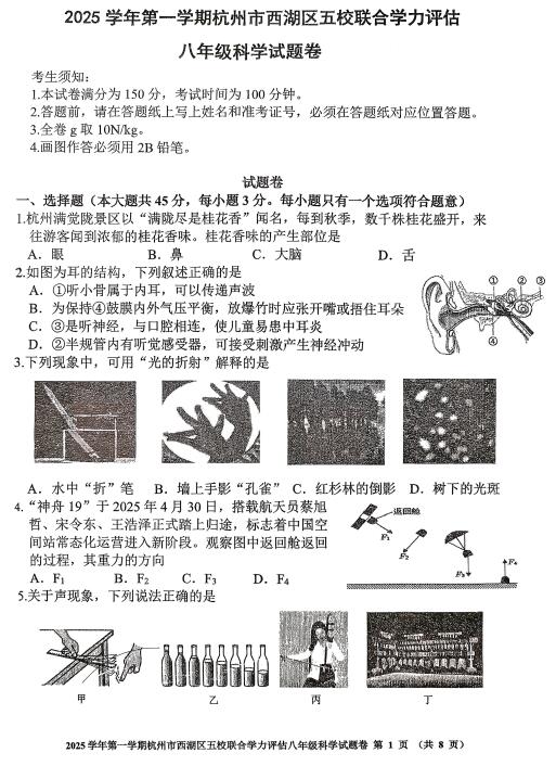 浙江省2025学年第一学期杭州市西湖区五校联合学力评估 八年级科学试题卷(扫描PDF版,无答案 1-2章)