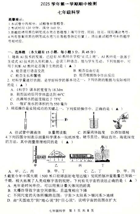 浙江省台州市玉环市2025学年第一学期期中检则 七年级科学(扫描PDF版,无答案 1-3章)