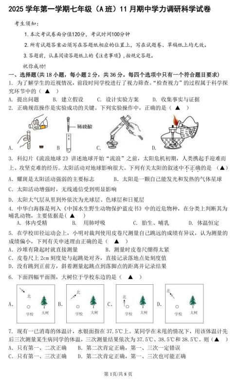 浙江省温州市育英实验学校2025学年第一学期七年级(A班)11月期中学力调研科学试卷(扫描PDF版,含答案 1.1-3.1)