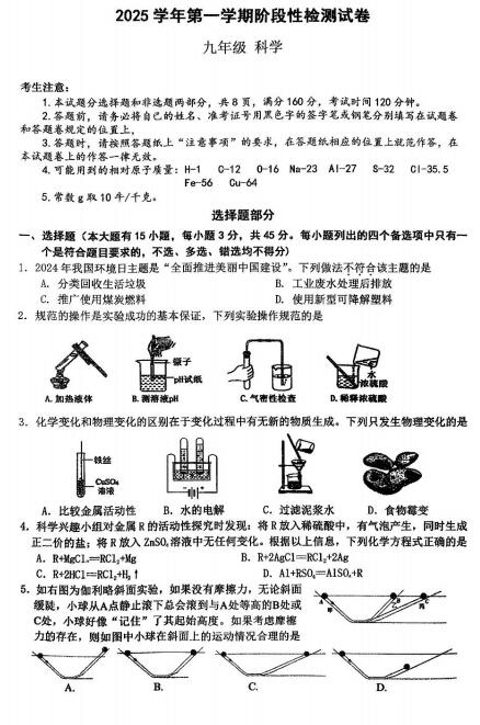 浙江省绍兴市新昌县潜溪中学2025学年第一学期阶段性检测试卷 九年级科学(扫描PDF版,无答案 1.1-3.3)