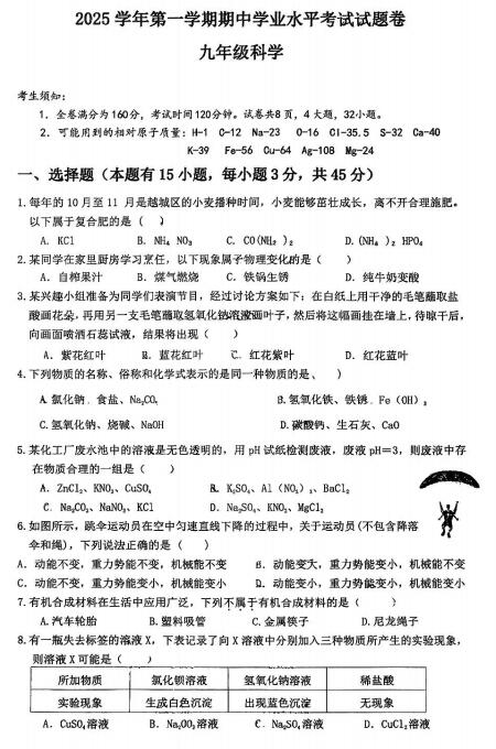 浙江省绍兴市越城区树人中学2025学年第一学期期中学业水平考试试题卷 九年级科学(扫描PDF版,无答案 1.1-3.2)