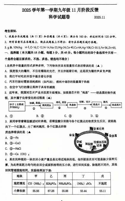 浙江省湖州市第五中学2025-2026学年九年级上学期科学期中试卷(扫描版,无答案)