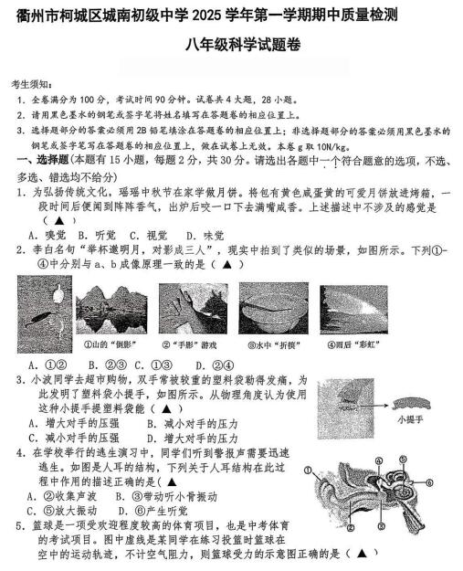 浙江省衢州市柯城区城南初级中学2025学年第一学期期中质量检测 八年级科学试题卷(PDF版,无答案 1-2章)